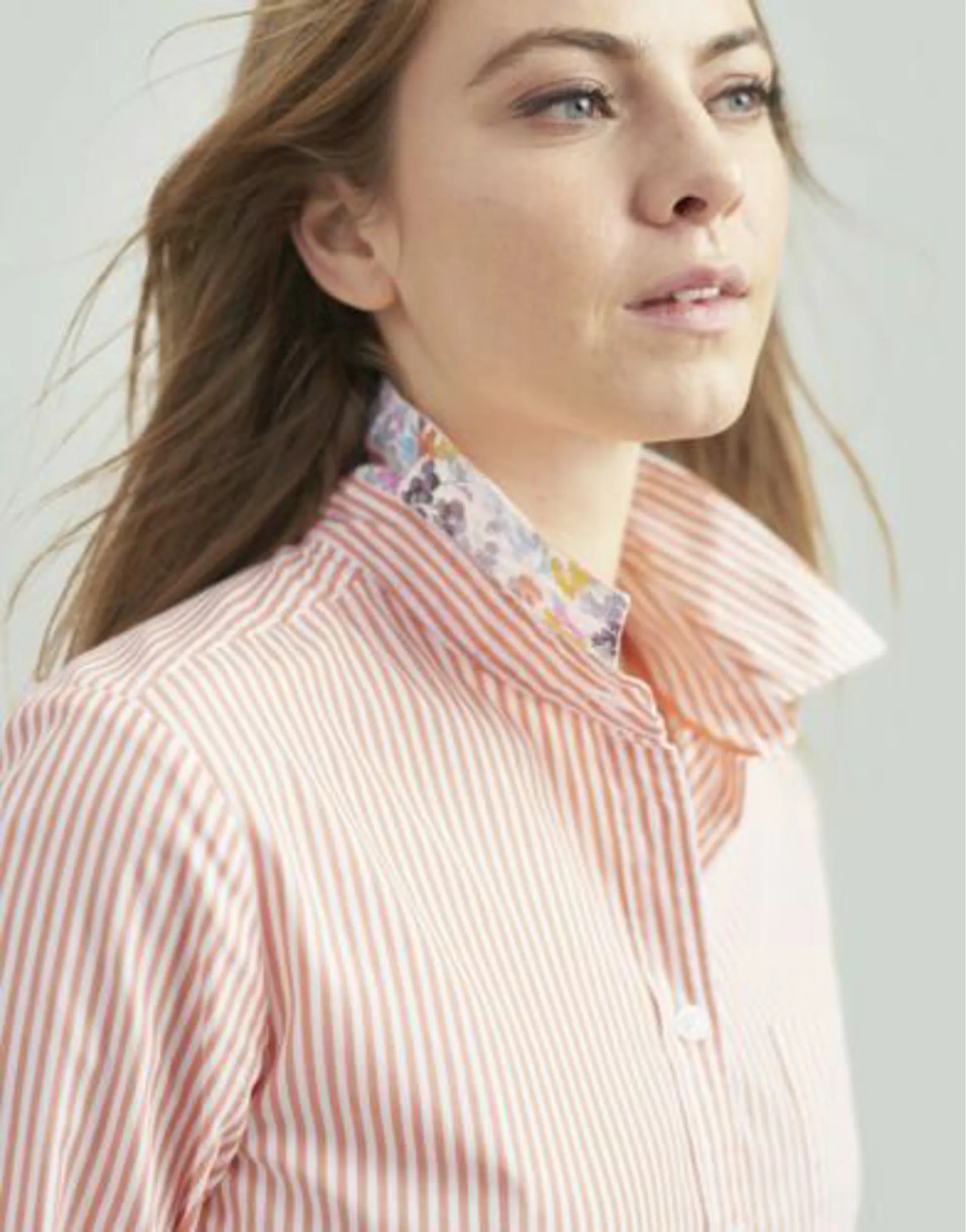 Classic ladies shirt from Joules - features white and orange stripe with floral under collar.