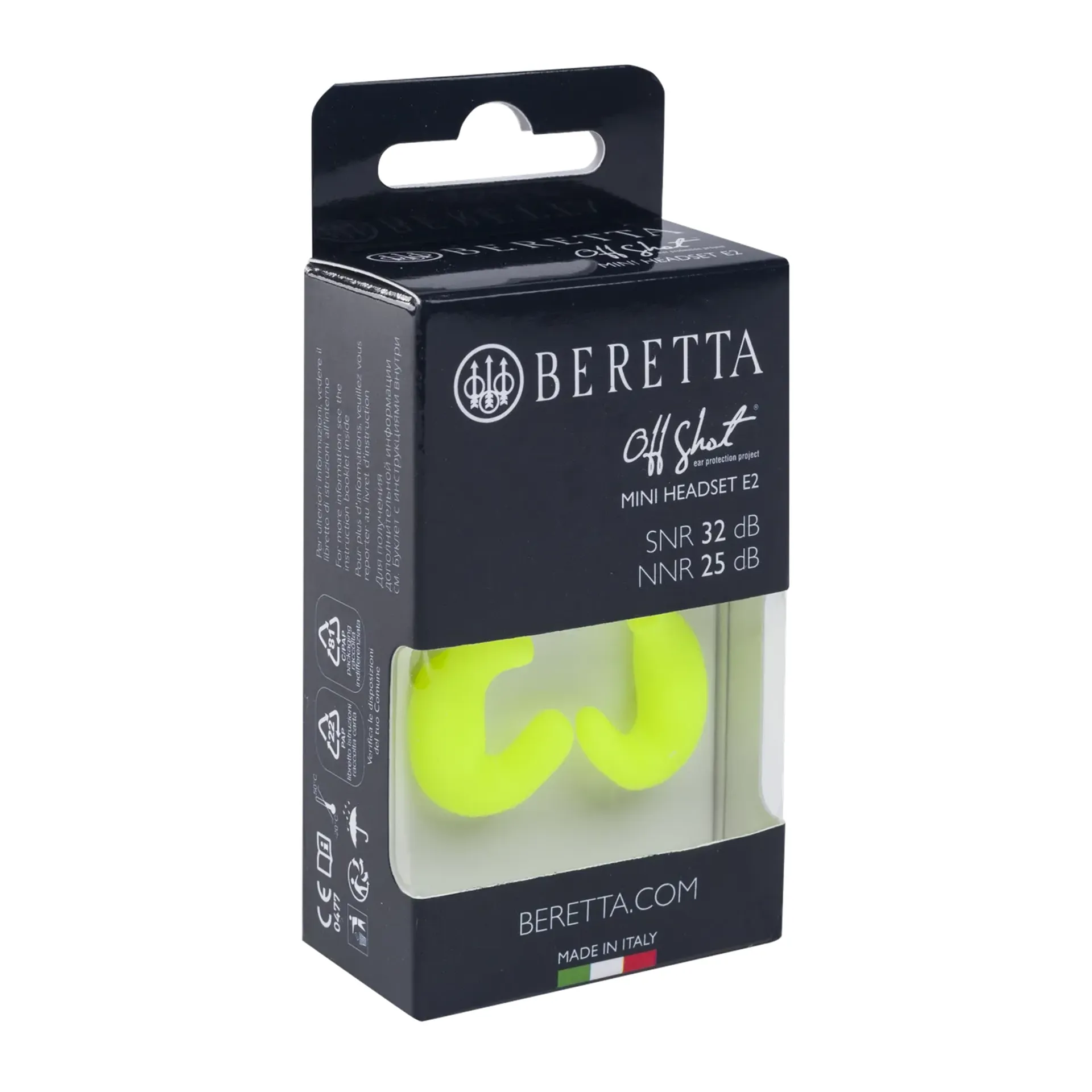 The Mini Headset E2 from Beretta guarantees noise protection of 32db SNR. The soft silicone adapts to fit comfortably for any ear shape. The ergonomic shape makes them stable during use.